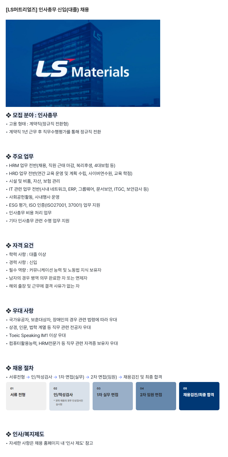 LS머트리얼즈 인사총무 신입(대졸) 채용 날짜 2025-09-26 오후 7:27:56 조회수 421 채용공고 바로가기https://lsmaterials-recruit.career.greetinghr.com/ 이전글 (마감) LS머트리얼즈 생산기능직(경력무관 채용) 목록