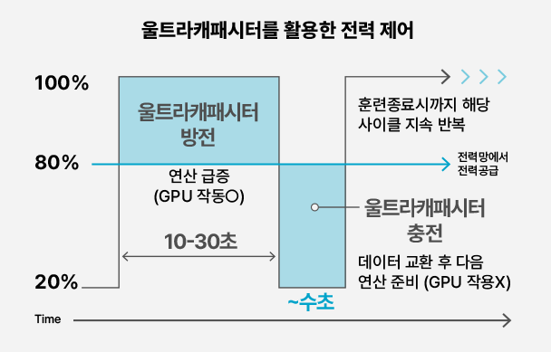 - 계통전력은 빠르게 변하는 GPU 부하 패턴을 따라갈 수 없음