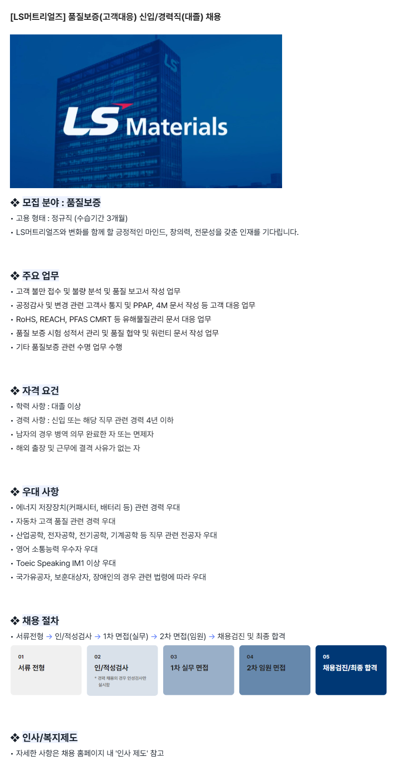 LS머트리얼즈 품질보증(고객대응) 신입/경력직(대졸) 채용 날짜 2026-01-26 오후 1:54:11 조회수 497 채용공고 바로가기 이전글 LS머트리얼즈 환경안전 신입/경력직(대졸) 채용 다음글 LS머트리얼즈 품질보증(모듈품질관리) 경력직(대졸) 채용 목록