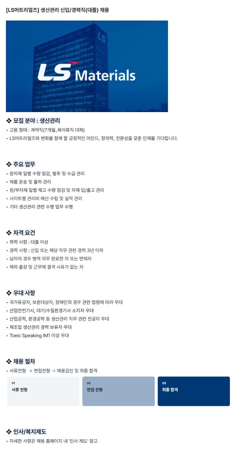 LS머트리얼즈 생산관리 신입/경력직(대졸) 채용 날짜 2026-02-05 오전 10:58:15 조회수 971 채용공고 바로가기 이전글 (마감) LS머트리얼즈 품질보증(모듈품질관리) 경력직(대졸) 채용 다음글 LS머트리얼즈 연구개발 경력직(대졸) 채용 목록