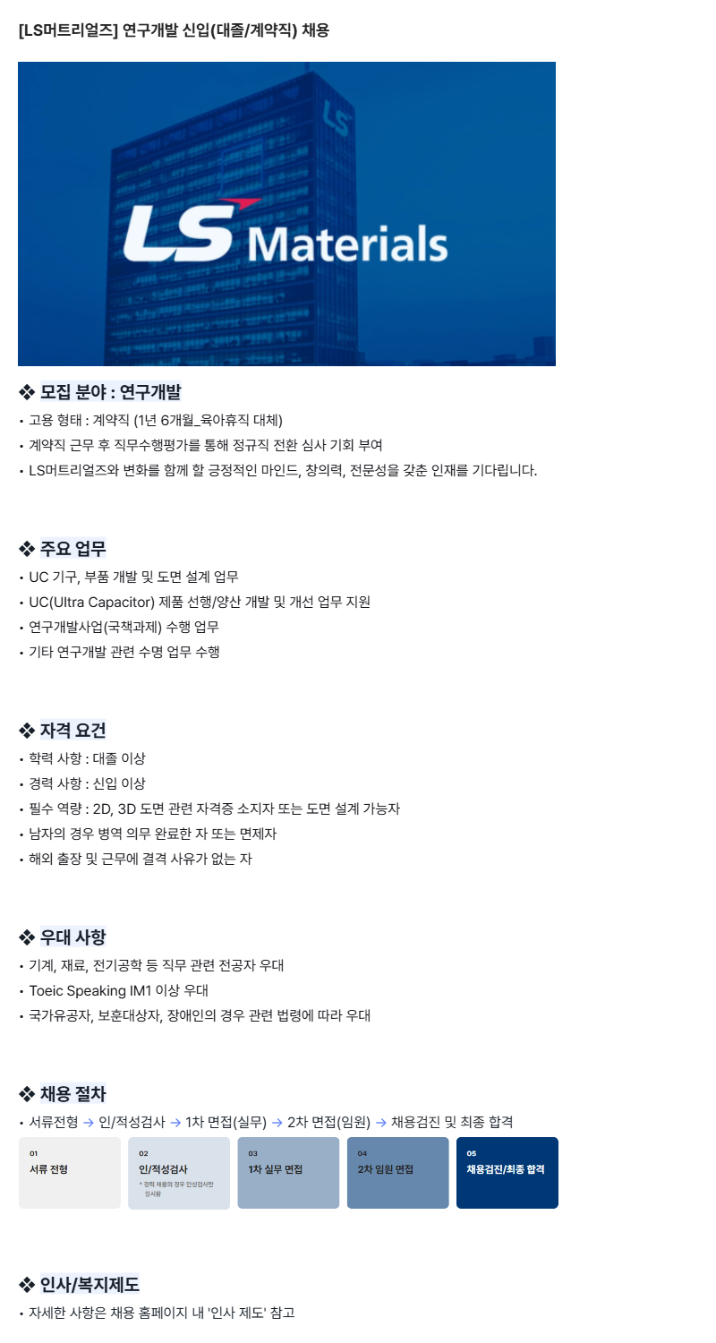 LS머트리얼즈 연구개발 신입(대졸/계약직) 채용 날짜 2026-04-08 오후 4:46:48 조회수 175 채용공고 바로가기 이전글 (마감) LS머트리얼즈 연구개발 경력직(대졸/계약직) 채용 목록